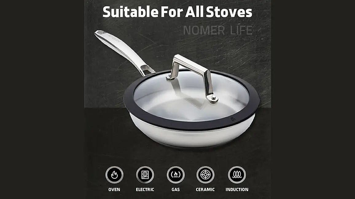 Experience versatile cooking with the NOMER LIFE Stainless Steel Frying Pan. Designed for all stovetops – OVEN, ELECTRIC, GAS, CERAMIC, & INDUCTION – it delivers even heat and superior durability. Features a clear glass lid and ergonomic handle. Easy to clean and built to last. Perfect for any kitchen! a more intuitive cooking experience.