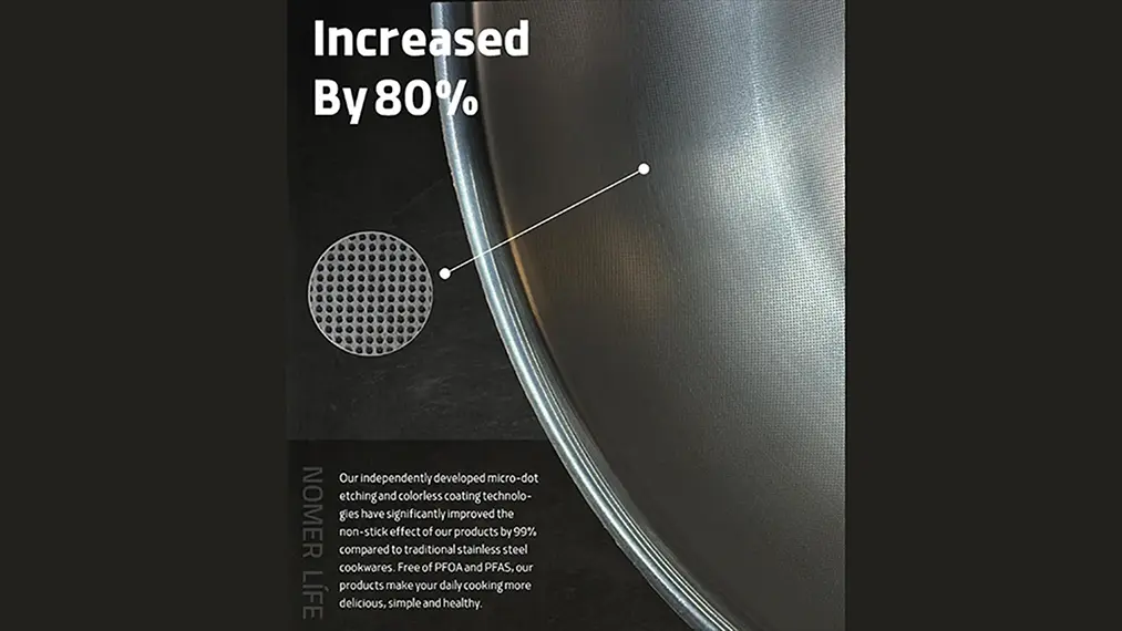 Our innovative micro-dot etching and advanced colorless coating technology deliver 80% increased non-stick effectiveness compared to traditional stainless steel. Enjoy healthier, easier cooking, free from PFOA and PFAS.