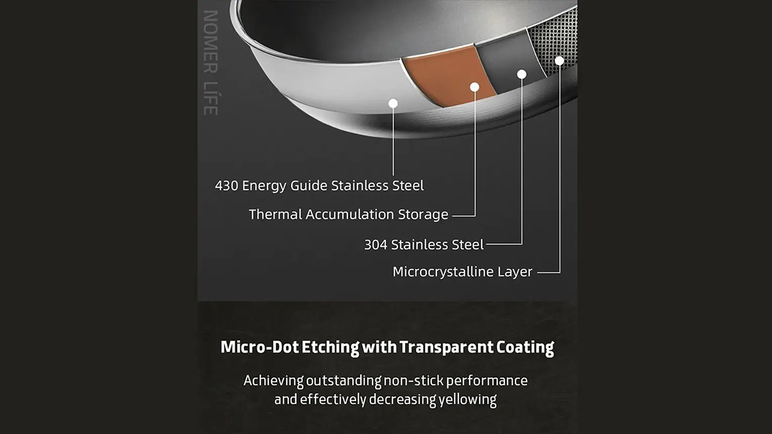 Experience superior cooking with our innovative pan, featuring a multi-layer design for optimal heat distribution and non-stick performance. The 430 Energy Guide Stainless Steel and Thermal Accumulation Storage provide efficient heating, while the 304 Stainless Steel and Microcrystalline Layer ensure durability. Our Micro-Dot Etching with Transparent Coating delivers outstanding non-stick capability, effectively preventing yellowing and maintaining pristine appearance.